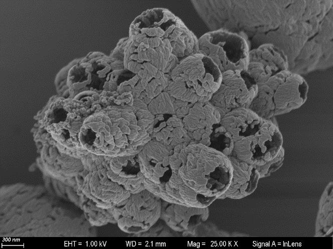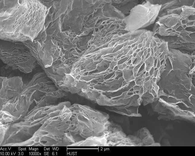 作品背景:本图为实验过程中研究不同反应时间下石墨烯水凝胶生长情况的SEM图片,图中可以观察到石墨烯水凝胶在220℃,反应时间为48小时条件下得到的类空心松子状的材料。