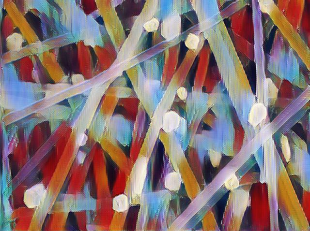 作品解读:交错的线条,散落其中的点,二者激烈的碰撞与融合在夸张的色彩渲染下显现出极其强烈的情感。鲜明的红白蓝三种颜色被仔细排布在整幅画作,亮与暗的相互映衬对比同线条与电之间的配合完美契合。整幅作品向抽象派大师毕加索致敬,颜色的选取与其分布方式的灵感都来源于其画作,通过色彩,线条,点的配合,显示出作者内心无比强烈的情感,对科学道路探索的热烈情感能够透过画作为人真切地感知。