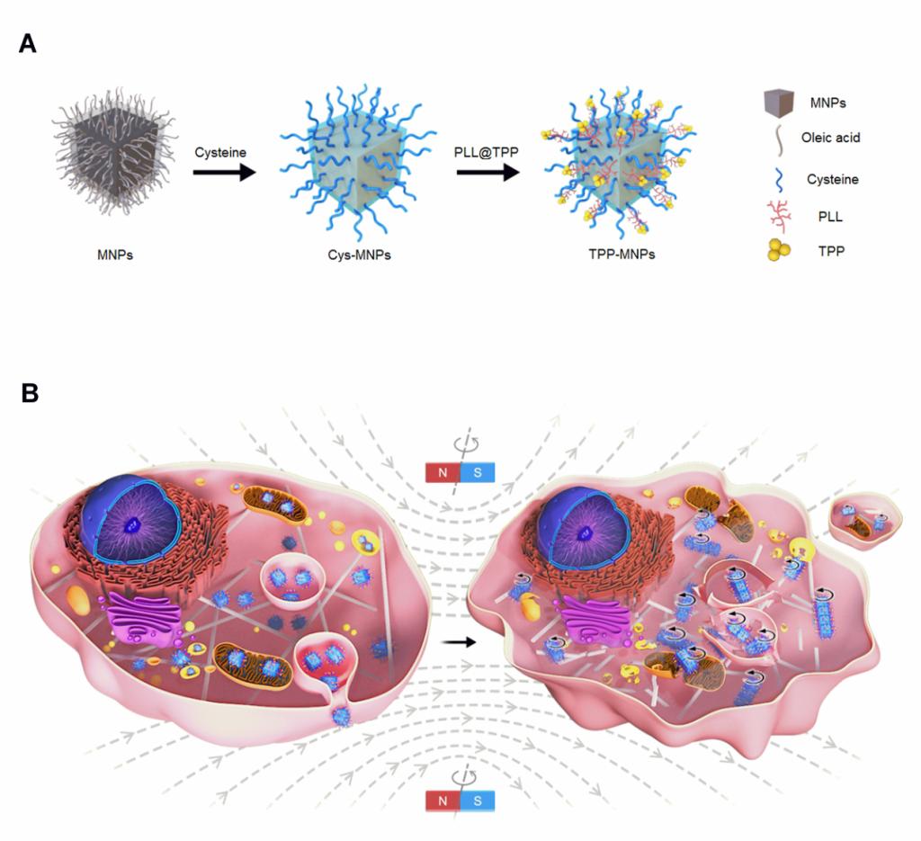 她的学生陈梦伟和吴交交等从2015年起,开始摸索合适的组装材料。要想材料的个头小力气大,当然就要铁含量高,这样在外加磁场的作用下,磁力刀产生的旋转力和位移力(被吸引力)才会更大;再者,还须找到力的作用点(支点)。“如果说,我们2017年研发的55纳米的磁力刀是靠不断让磁力场施加外力,刺激其发挥作用,这次陈梦伟和吴交交等的工作就是一刀锁住命门。”成昱介绍,经过多次试验,最终找到合适的磁性纳米材料;又经过反复的修饰,最终很好地达到了进入细胞必须的水溶性要求。当修饰过的材料,穿透细胞膜结构,首先进入溶酶体,然后凭借其小身材“逃逸”出来,进入线粒体。在靶向磁场的作用之下,材料开始自组装,变成磁力刀。组装完毕后,开始向电势高的癌细胞线粒体发起攻击,破坏其结构,使其无法复制生长。