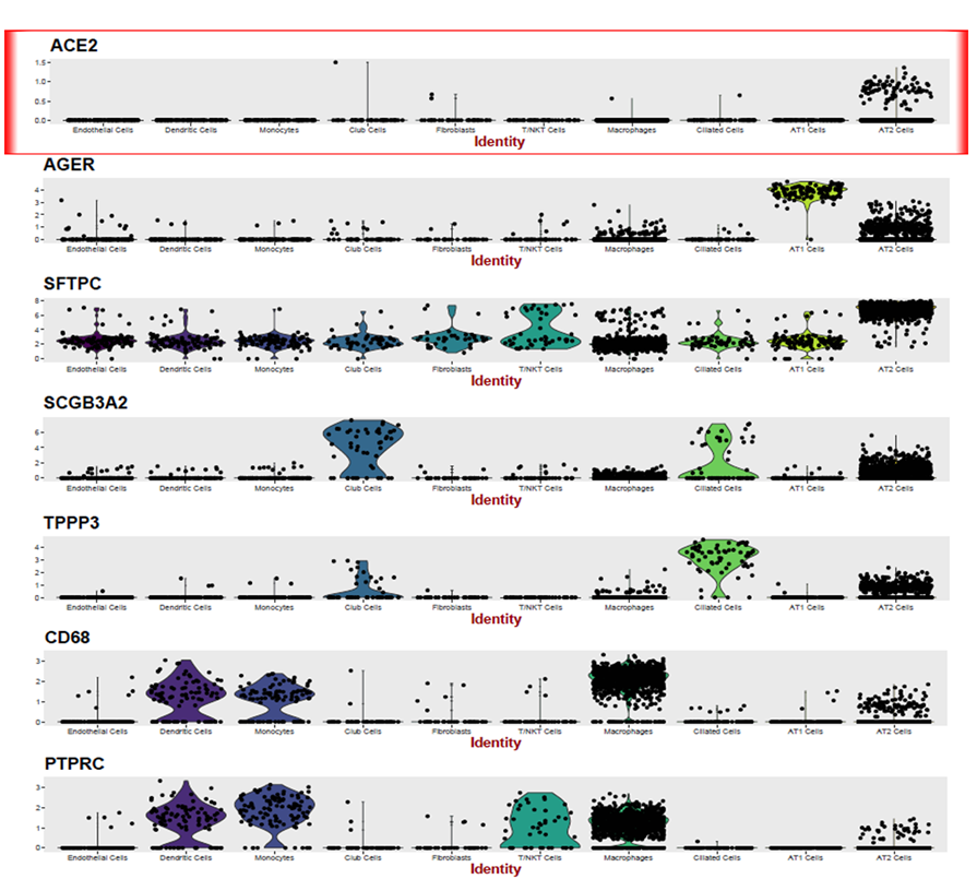 左为介绍,研究结果显示,大约0.64%的人类肺细胞会表达ACE2,而这些细胞中的83%是II型肺泡上皮细胞(AT2);表达ACE2的II型肺泡大约占所有AT2细胞的1.4%。其他细胞如I型肺泡(AT1)、气道上皮细胞、成纤维细胞、内皮细胞和巨噬细胞等也会表达ACE2,但是占比极低,且个体间差异较大。
