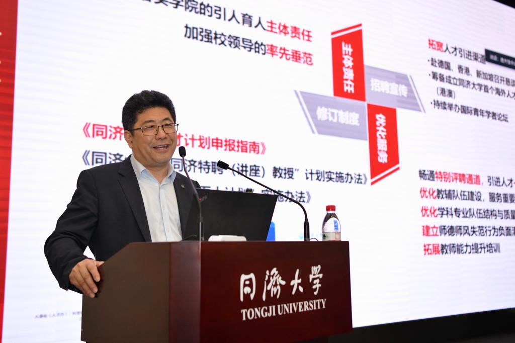 陈杰以《逐梦前行,静待花开》为题,向参加论坛的海内外青年学者介绍了同济大学的总体情况及发展成就。他以一幅幅生动照片,讲述了建校113年来一代代同济人爱国奋斗、赤诚报国的故事,展现了学校一个个学院学科发挥自身优势和特色,为国家重大工程建设、经济社会发展贡献的同济智慧、同济力量。他表示,同济大学将为海内外青年人才提供施展才华的广阔舞台,学校热诚欢迎青年才俊,“同济天下,未来有你”。
