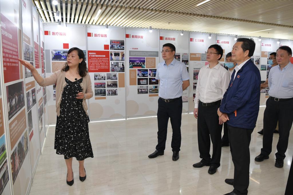 随后,洪天云一行来到我校衷和楼大厅,参观在此展出的《同济大学定点扶贫工作图片展》,听取学校定点扶贫工作介绍。自2013年我校按照中央和教育部滇西扶贫统一部署,定点帮扶云南省大理自治州云龙县以来,依托自身学科和人才优势,在干部挂职、规划编制、教育扶智、医疗服务、人员培训、永安示范、党建助力、产业支持、志愿服务、资金筹措等方面精准施策,推动当地经济社会跨越发展,全面助力云龙县打赢脱贫攻坚战。经过校地双方的持续努力,今年5月16日,云龙县宣布退出贫困县序列。