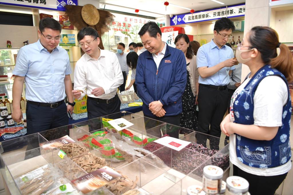 在方守恩陪同下,洪天云一行首先来到位于彰武路81号的云南大理云龙高原农特产品展销中心(上海),参观在此展销的一系列农特产品,了解店内农特产品销售情况,并品尝了诺邓火腿、高原茶等特色产品。该展销中心于2017年7月揭牌,由我校免费提供场地,并在宣传、销售等方面提供支持,通过切实举措推动云龙产业扶贫工作。