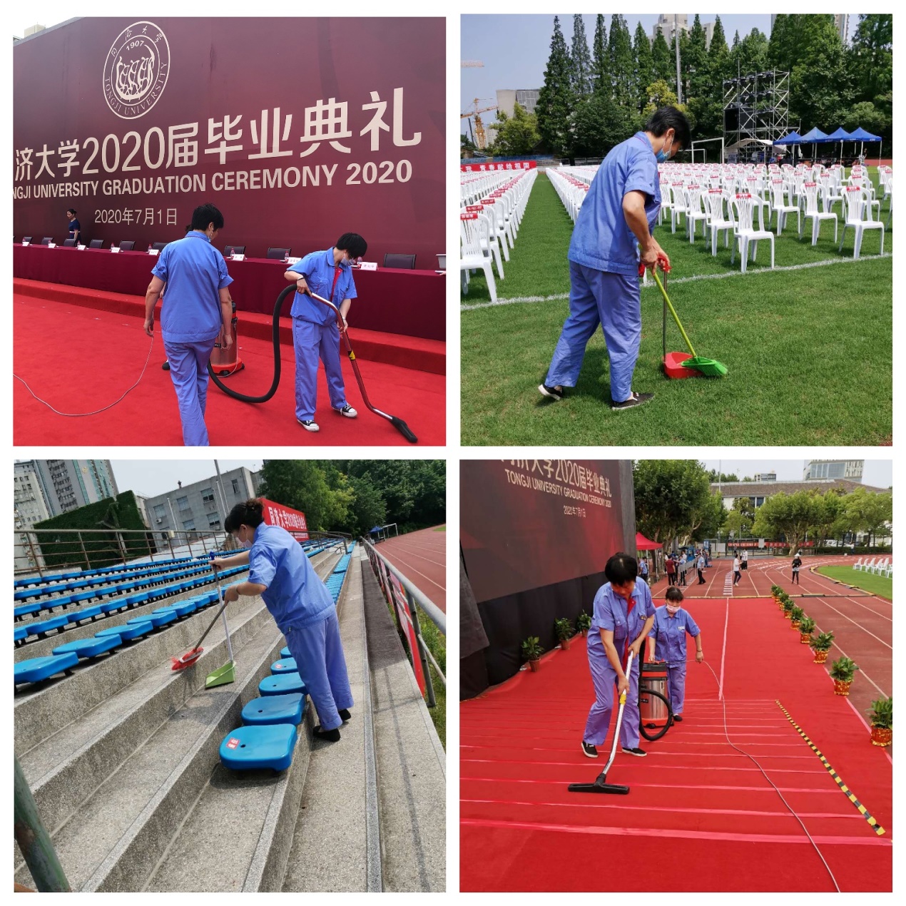 除做好各项日常后勤保障工作外,物业还为学生毕业提供了暖心的后勤保障服务:为保证毕业典礼顺利召开,四平路校区办公楼宇管理部非常重视,负责人多次到现场查看指挥,并与体育部、保卫处、能源中心等部门多次沟通协调。安排保洁加强场地的冲洗、清扫与消毒,并安排保安对各通道加强值守,确保人员进出安全。此次服务保障共计出动员工150余人次。