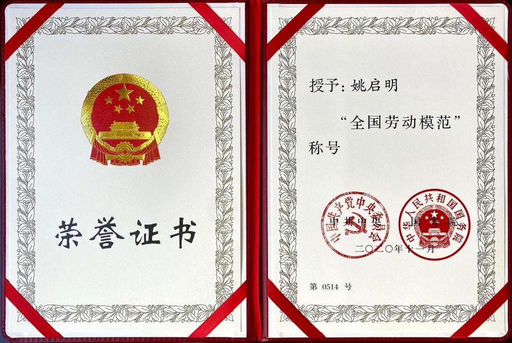 姚启明曾荣获全国五一劳动奖章、全国建设系统先进工作者、全国向上向善好青年、全国示范性劳模和工匠人才创新工作室等20余项荣誉。