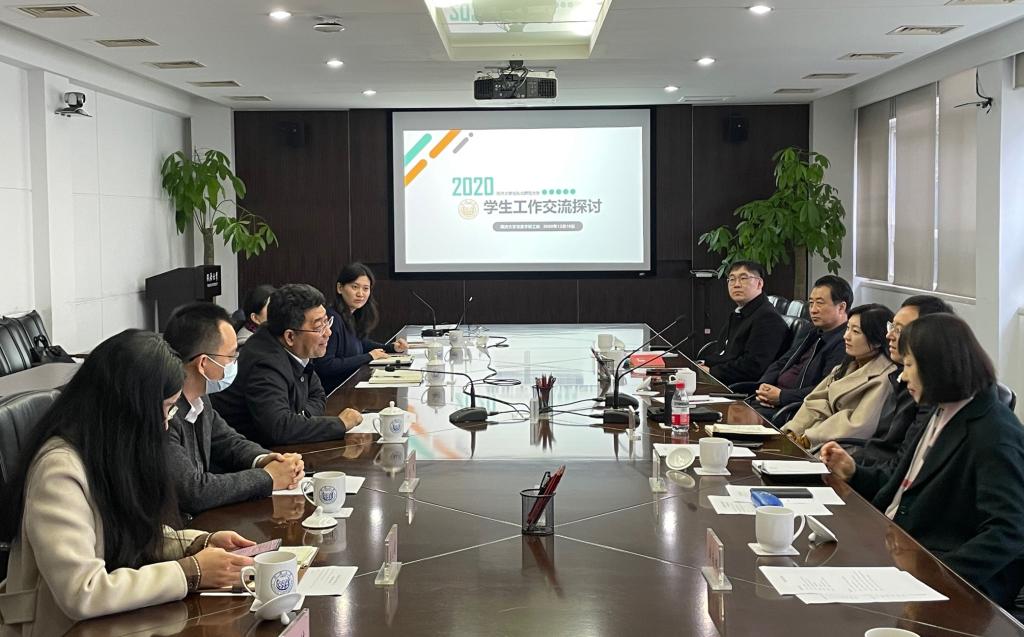 吕培明对常青一行的来访表示欢迎,并介绍了学校办学历史、总体概况和学科建设情况。双方围绕思想政治教育工作“十四五”规划、辅导员队伍建设、研究生思想政治教育及学生社区管理等方面进行了深入探讨。