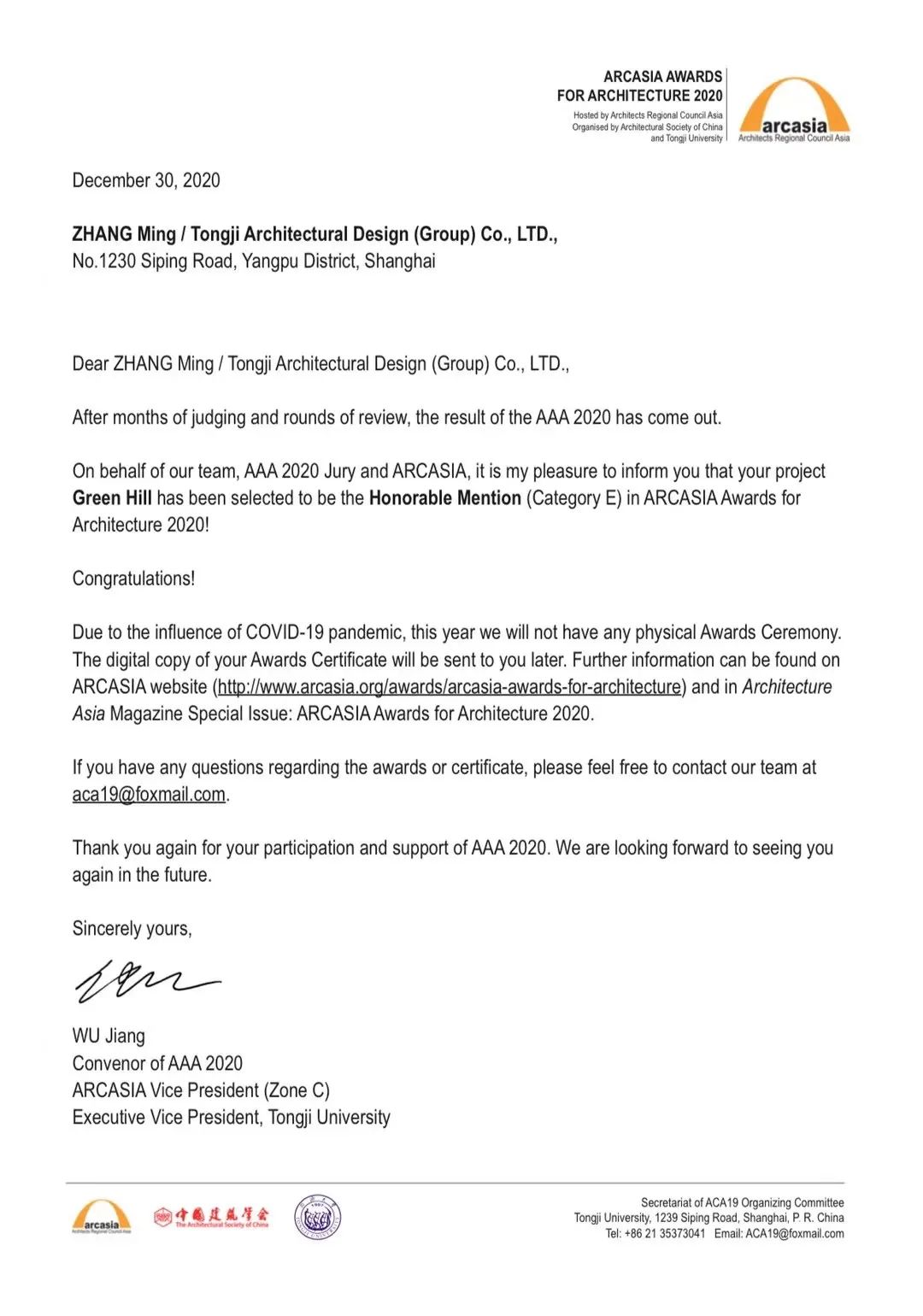 亚洲建筑师协会(Architects Regional Council Asia)是由亚洲最具代表性和最有权威的国家或地区的建筑师学会组成的亚洲建筑师组织,于1979年在印度尼西亚雅加达成立,目前拥有21个建筑师团体。协会下设的亚洲建筑师协会建筑奖(ARCASIA Awards for Architecture)是亚洲地区建筑界最高建筑设计大奖,旨在推出亚洲地区的优秀建筑作品,鼓励传承亚洲精神,推动亚洲建筑环境的提升。该奖项涵盖住宅项目、公共设施建设、工业建筑、保护项目、综合类和社会责任建筑6大建筑类别,各设置金奖、荣誉提名奖和提名奖。此次共有44个项目荣获2020年度亚洲建筑师协会建筑奖。