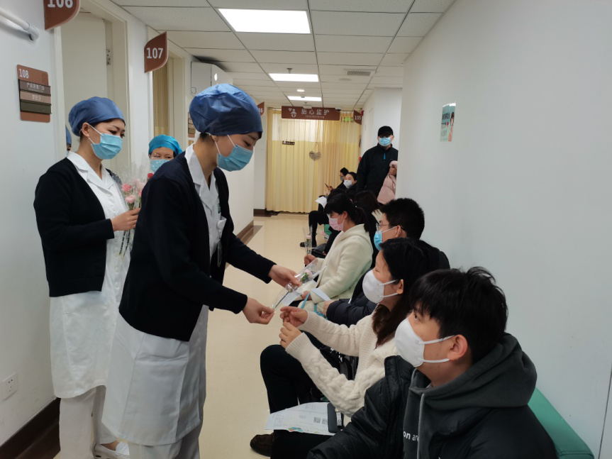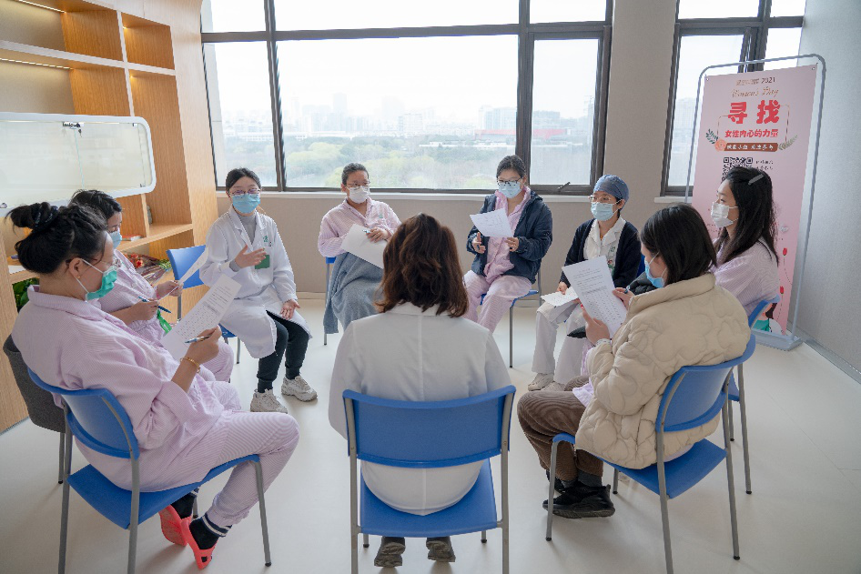 3月8日当天,附属第一妇婴保健院浦西长乐路院区还为前来就诊的女性患者送上美丽的康乃馨。而浦东高科西路院区则举办了“寻找女性内心的力量”沙龙活动,20名住院患者和医院社工、志愿者共同参与互动交流,为心灵赋能。