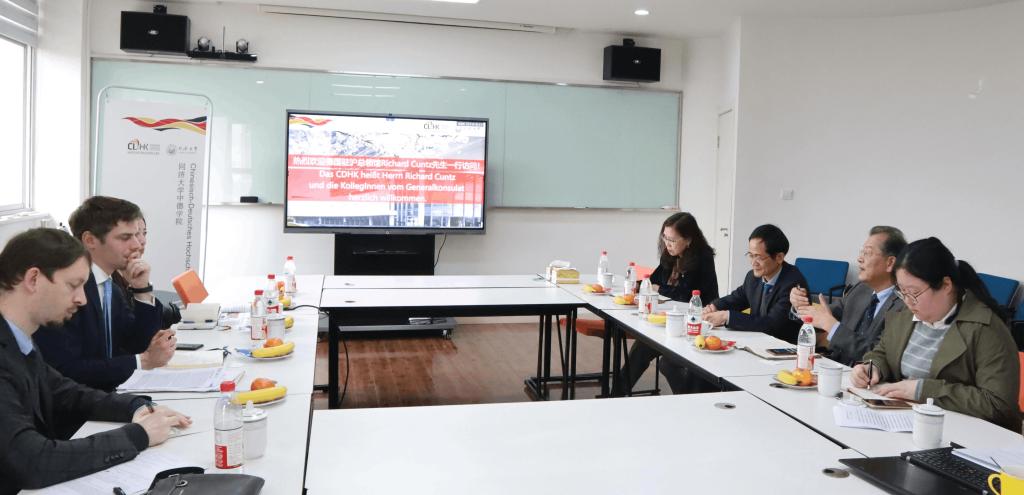 3月18日,德国驻沪总领馆科教领事孔瑞超(Richard Cuntz)、领馆科技处代表曾红萍、易堂铭(Thomas Elz)访问我校中德学院,旨在了解学院“小核心、大外围、高层次”平台化转型成果和下一阶段工作设想。副校长雷星晖会见了孔瑞超一行。中德学院负责人和外事办公室代表参加会见。
