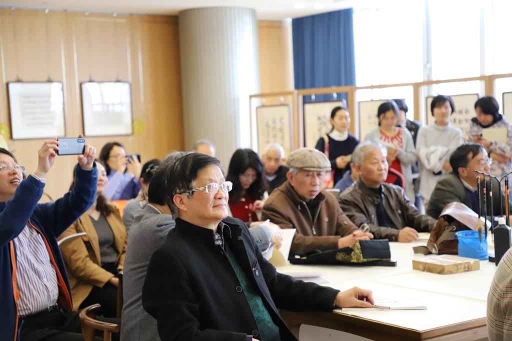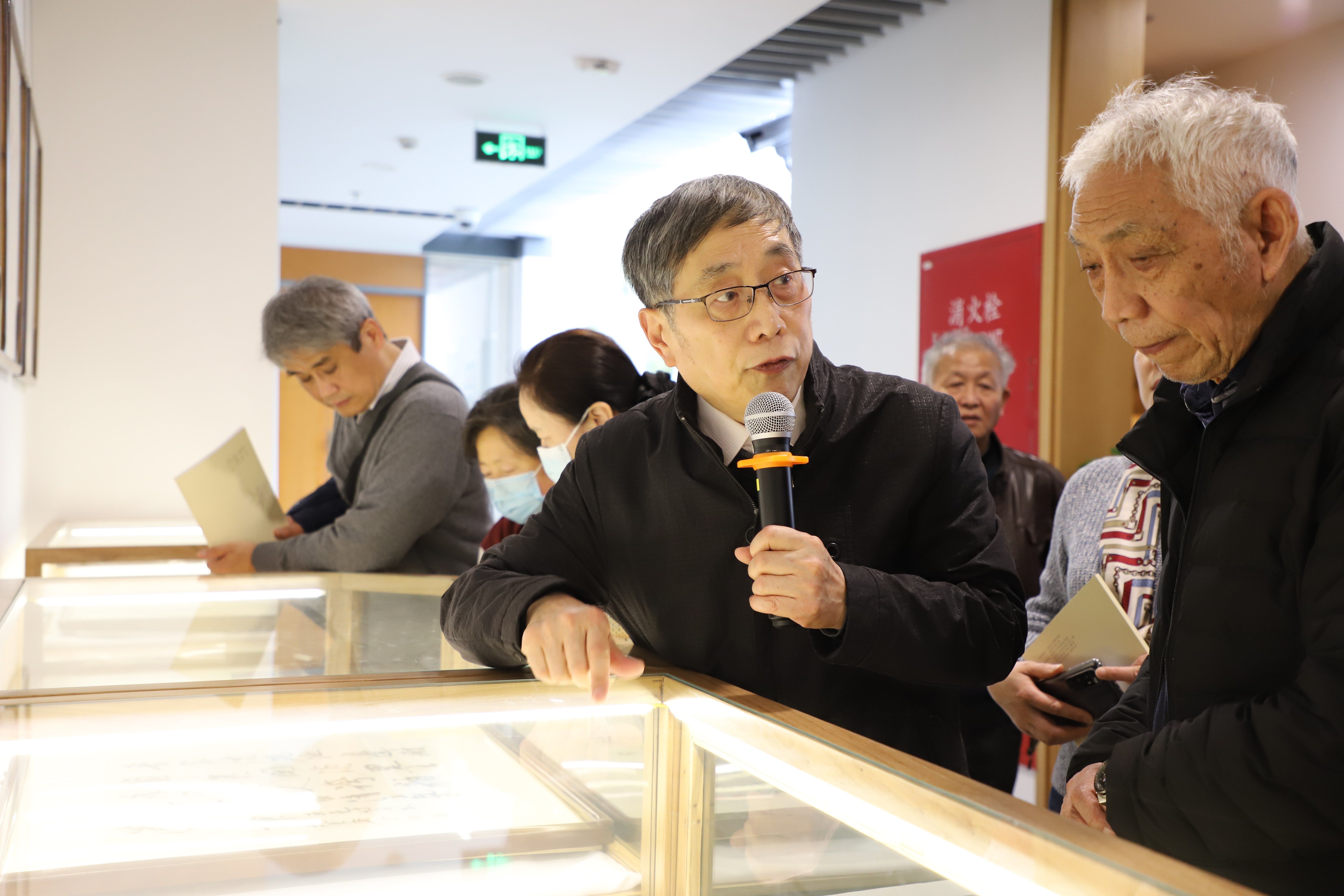 随后,现场观众参观了展览。江理平带领大家一起领略中国传统书画艺术之美,品鉴梅花高洁、雅丽的形象和不随世俗的精神。此次共展出近80幅书画作品,其中书法作品以咏梅诗词入笔,楷、行、草、篆、隶诸体兼备,书者各展所长,把书风与诗词意境结合,风格多样,各臻其妙,于笔墨挥毫间赞誉梅花精神。其中,有书者以四体书法创作同一首诗,颇具特点,令人耳目一新。从国画作品上看,或为红梅折枝,或为墨梅写意,疏影横斜,暗香浮动,画者各抒笔墨展现梅花的瑰丽姿态与神韵风采,从而歌颂梅花的铁骨铮铮的坚贞品格,引发观者共鸣。