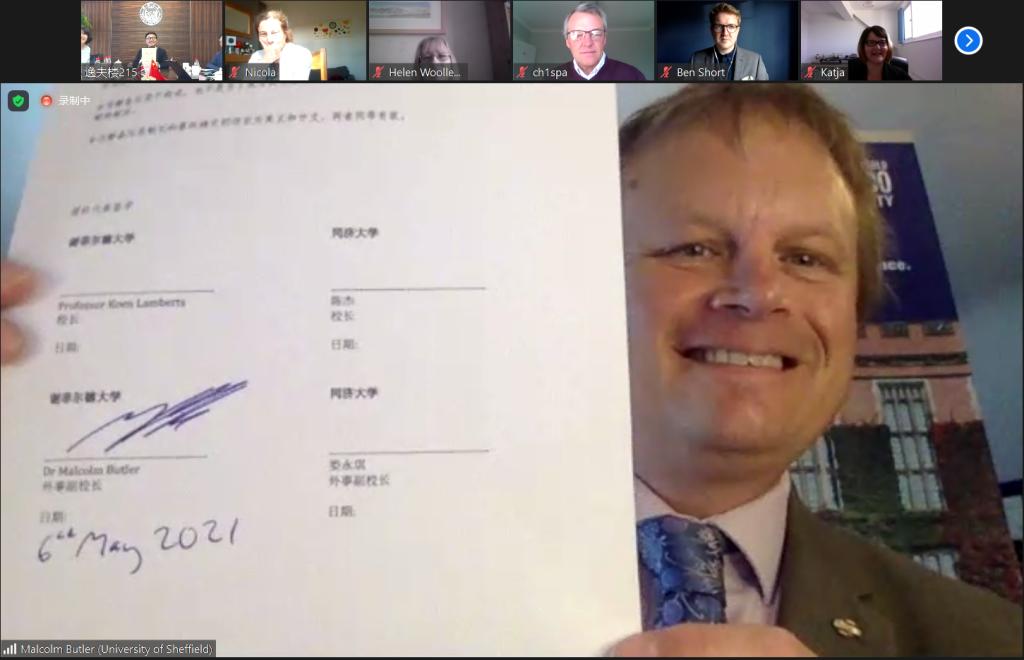 5月6日,我校与英国谢菲尔德大学(University of Sheffield)在线召开合作讨论会,会上,我校副校长娄永琪与谢菲尔德大学外事副校长Dr.Malcolm Butler分别代表两校续签校际合作协议。我校医学院、建筑与城市规划学院、材料科学与工程学院和外事办公室相关代表参加会议。