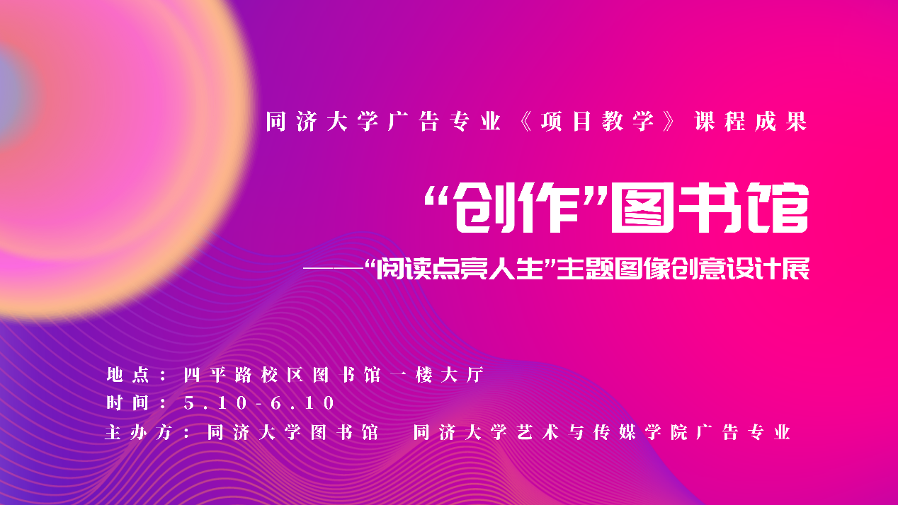 5月10日,校图书馆和艺术与传媒学院联合举办的《“创作”图书馆——“阅读点亮人生”主题图像创意设计展》在四平路校区图书馆一楼大厅开幕。此次展览也是我校广告专业《项目教学》课程的成果展示,展出了包括2016级本科生宋沛阳荣获上海市公益广告大赛金奖作品在内的65件作品。展览将持续至6月10日。
