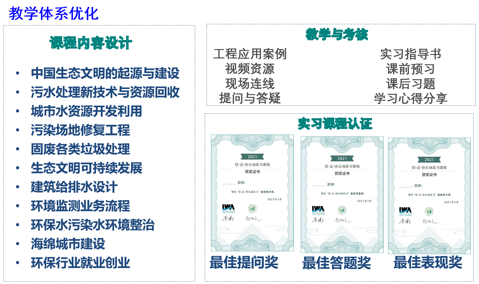 在第三期“云端实习”课程中,教学团队进一步对课程内容、教学模式及课程资源等进行了优化。讲座内容涉及中国生态文明的起源与建设、污水处理新技术与资源回收、城市水资源开发利用、污染场地修复工程、固废垃圾处理、建筑给排水设计、环境监测业务流程、环保行业就业创业等主题。在教学模式方面,通过“工程应用案例-视频资源-现场连线-提问答疑”等环节增强云端实习的现场效果,通过“线上线下混合式学习”和“集中学习与分散学习”相结合的方式,增强了学生对生态文明思想理论与实践的深刻了解。在课程资源建设方面,在超星学习通平台上开设了线上教学课程,发布了实习指导书,设置了课前预习、课后答题、资源回看等模式以强化学习效果。