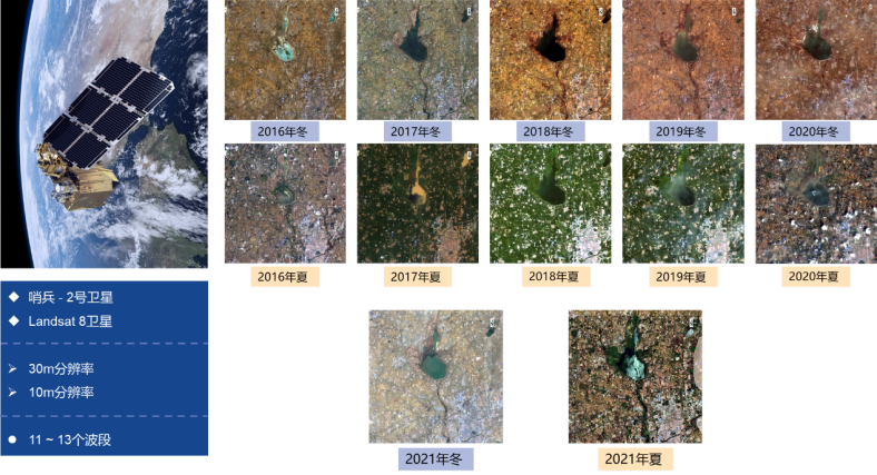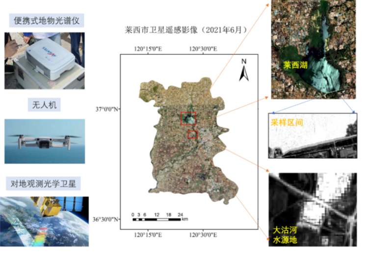 “天”即卫星遥感监测。团队成员通过“哨兵2号”10m空间分辨率卫星遥感,获取莱西市水系分布情况,大致掌握了该水系水体和植被及其周边建筑物的分布情况,并基于对遥感影像的多波段光谱特征分析,得到了调研水系的水体指数、氨氮浓度、叶绿素浓度和浊度等基本水质信息。团队成员还收集了研究区域2016年至2021年的多幅Landsat 8/OLI和Sentinel-2光学卫星遥感影像,并对数据进行了几何校正和裁剪处理。处理后的遥感数据通过影像的形式更加直观展示了大沽河和莱西湖流域5年来水体、植被等地物的变迁情况,从而反演得出莱西境内水资源储量减少的结论。