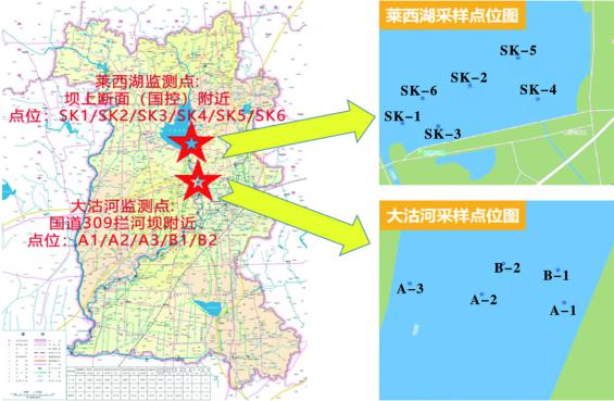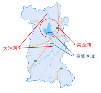 根据莱西市水利局、水文局提供的莱西市境内水系图及河道流向、河长、河宽等水文信息,团队成员对水位、流量、流速和流动方向变化等参数进行了实地考察,并在此基础上绘制了水质监测点位图。