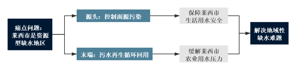 为进一步分析调研莱西市水环境状况,实践团队与莱西市住建局、生态环境局开展座谈。会上,实践团队了解到莱西市人均水资源占有量316m³(2018年),仅为全国平均水平的14.4%,属于资源型缺水地区,这是莱西市发展的重要一环,而如何保护水资源、实现污水再生循环回用成为实践团队制定解决方案的思路导向。