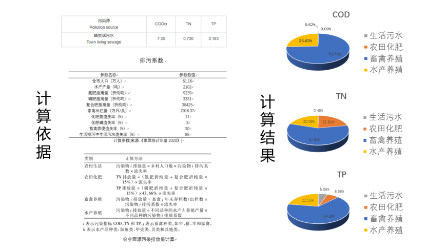 从源头分析,实践团队根据《2019年莱西市统计年鉴》相关数据,使用排污系数法对流域内农村生活、农田化肥、畜禽养殖和水产养殖污染源污染物进行定量核算,分析得出农村面源污染中畜禽养殖污染是主要原因,而农村生活污染和农田化肥施用也是水质污染重要成因。