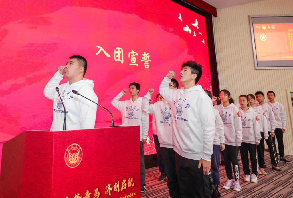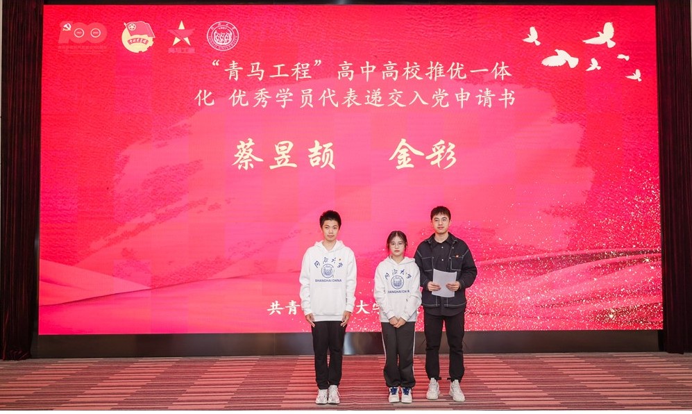 近年来,为更好发挥共青团组织育人功能,我校积极推进“青马工程”高中高校一体化培养工作,今年共吸纳63名上海市“青马工程”高中阶段重点培养对象。典礼上,“青马工程”高中高校推优一体化优秀学员代表郑重向党组织递交了入党申请书。