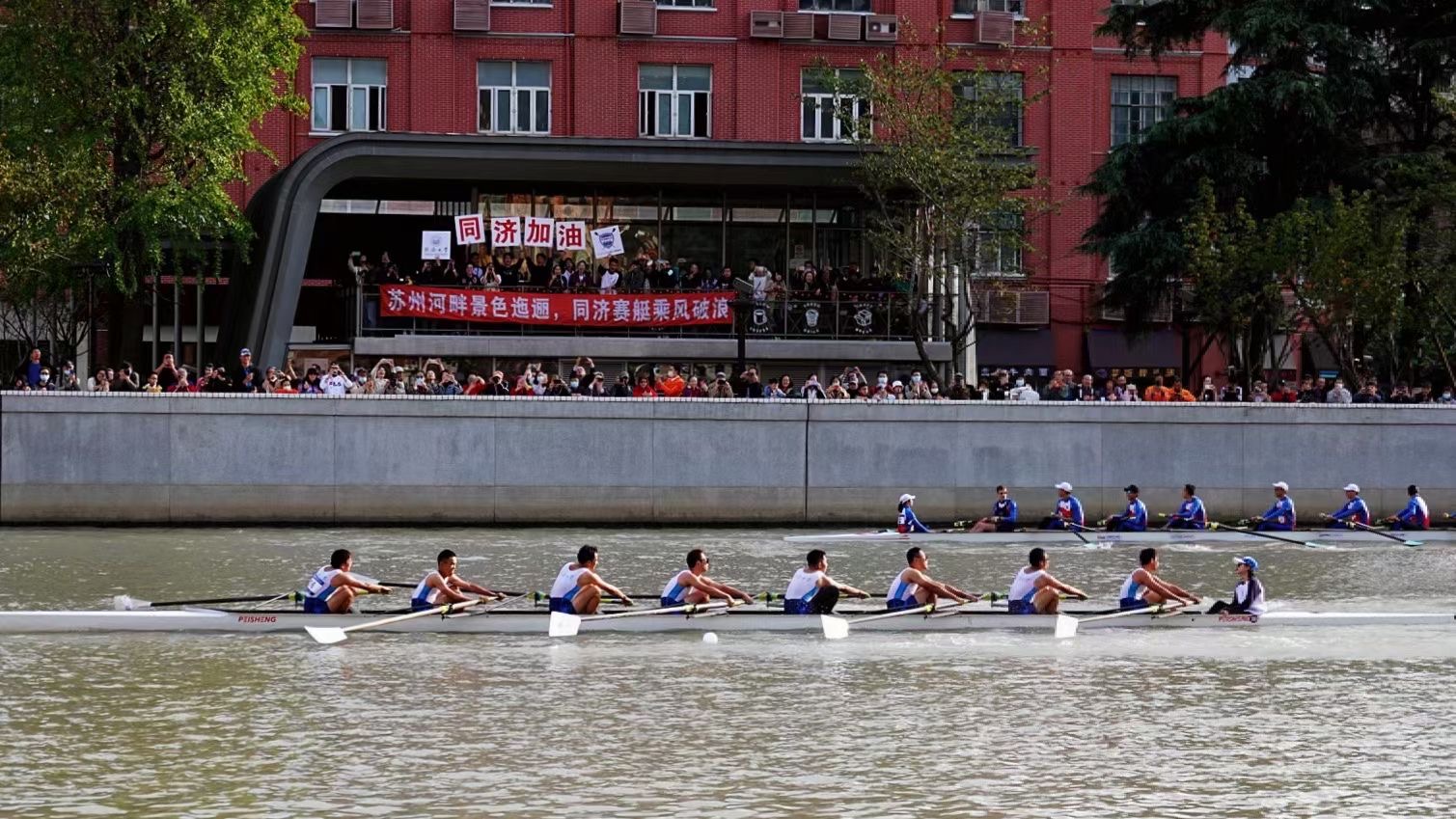 比赛期间,同济大学世联行赛艇队的往届队员和同济大学校友们还自发组织了啦啦队,在苏州河畔喊着“同济加油”的口号,为队员们打气加油。