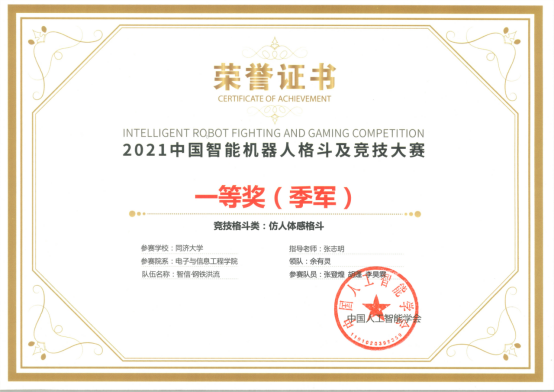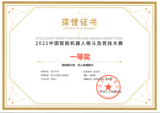 由中国高等教育学会主办的中国高校智能机器人创意大赛主题三,采用初赛、决赛赛制,来自同济大学、西安交通大学、华中科技大学、北京航空航天大学、北京理工大学等高校的队伍报名参赛。决赛阶段共评选出国赛获奖作品239件。其中,由我校电子与信息工程学院全国大学生智能车竞赛实验室组织,教师张志明和余有灵指导,张登煌、胡蓬、李昊霖3名学生组成的“钢铁洪流”队,获得统一部件组仿人格斗组一等奖(亚军),俞书彬、张雨、张梓瀚、朱睿潇4名学生组成的“济勤”队,获得视觉对抗A组一等奖。该项赛事已列入《全国普通高校学科竞赛排行榜》,旨在积极推进高校学生创新意识和创造能力培养,激励广大学生踊跃参加课外科技实践,有效推动新工科人才培养。