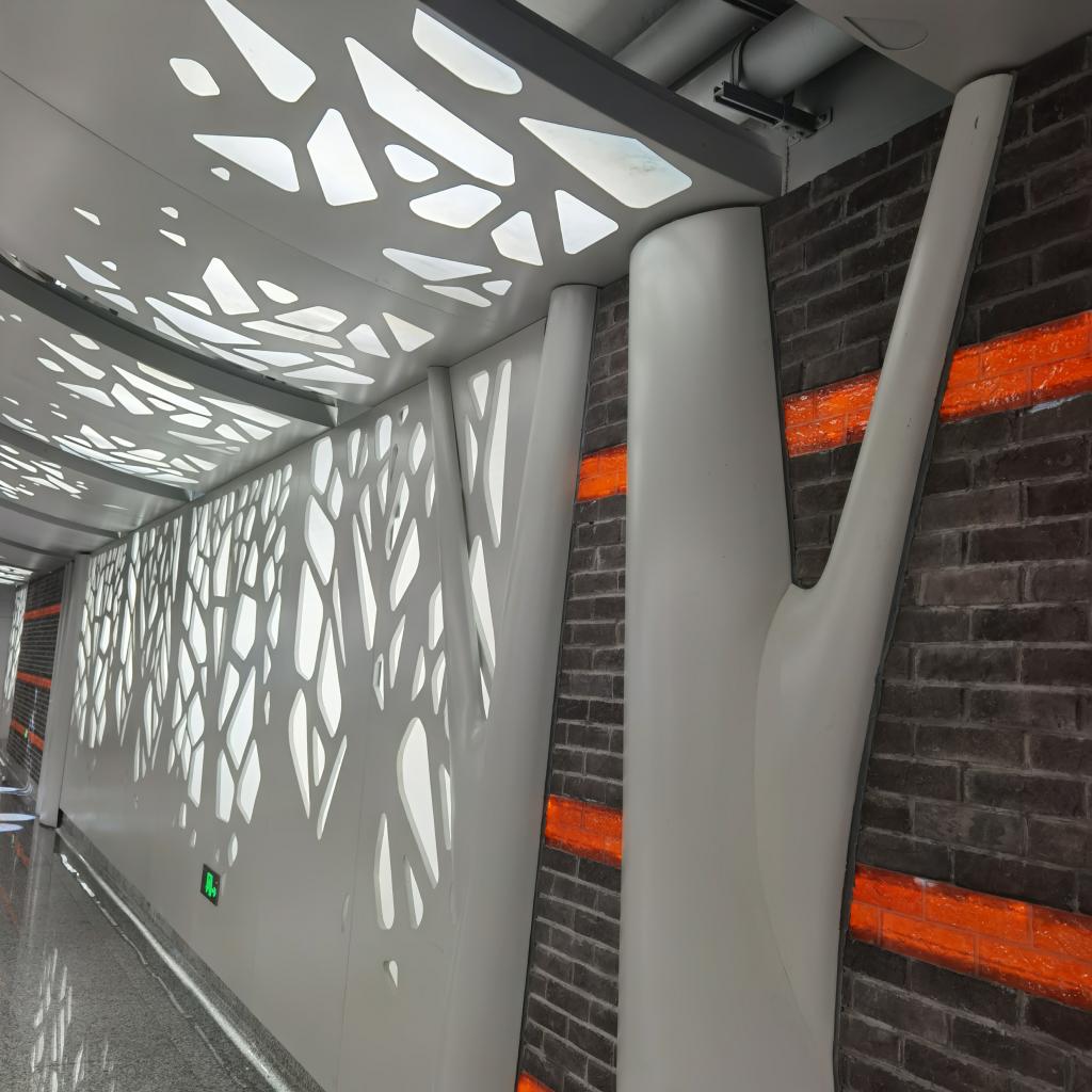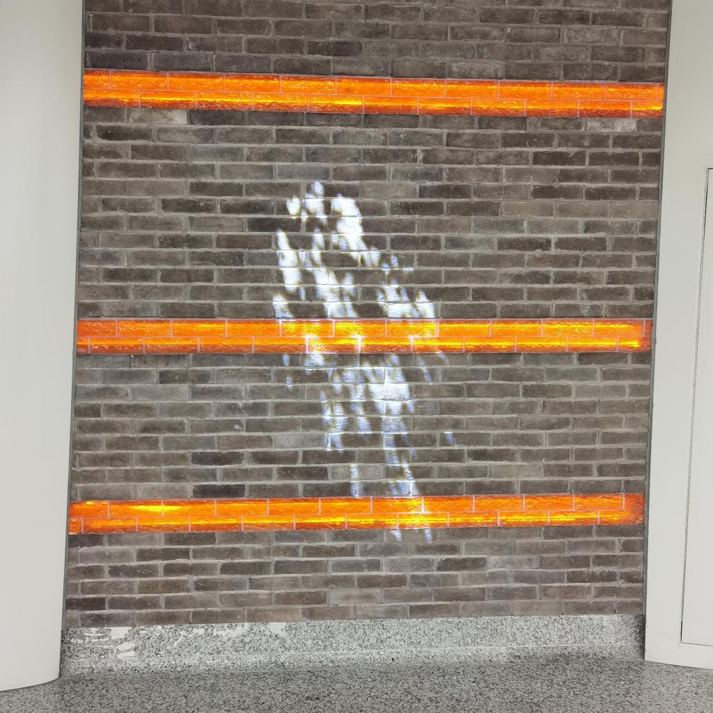 换乘、出站,通道里梧桐树影里的石库门青砖墙红腰带:黑灰的树干、亮白的树影,那是灯光效果里的树林,密密匝匝,一路迤逦伴随着你;再看,青灰的墙上红腰带,三条,间隔着划过去,凑近看红腰带里有灯光,红黄相配温暖人心。