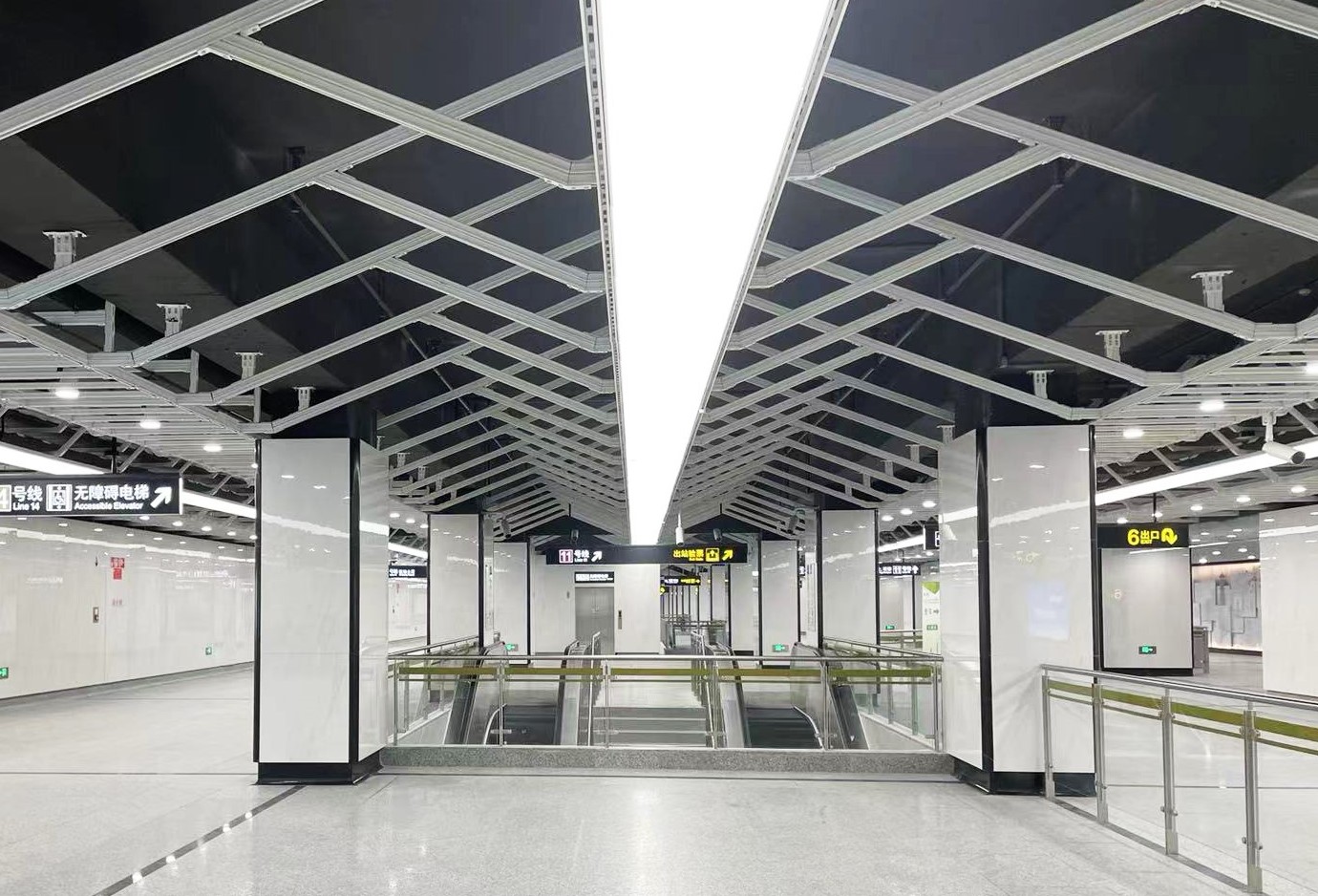 我们将14号线31个车站中的24个站都设计成了“标准车站”,它们是全线的底色:风管桥架收纳在白色基调的物件后面,乌漆黝黑的顶则是空空如也,你只能看到一根细细长长的管子,那是喷淋管,消防用的。“可以说黑色的部分就是我们全程规划的留白部分,以备将来之需。”郑鸣说,正如十几年前谁能想到微信、5G、物联网……2035年呢?所以我们要“留白”。