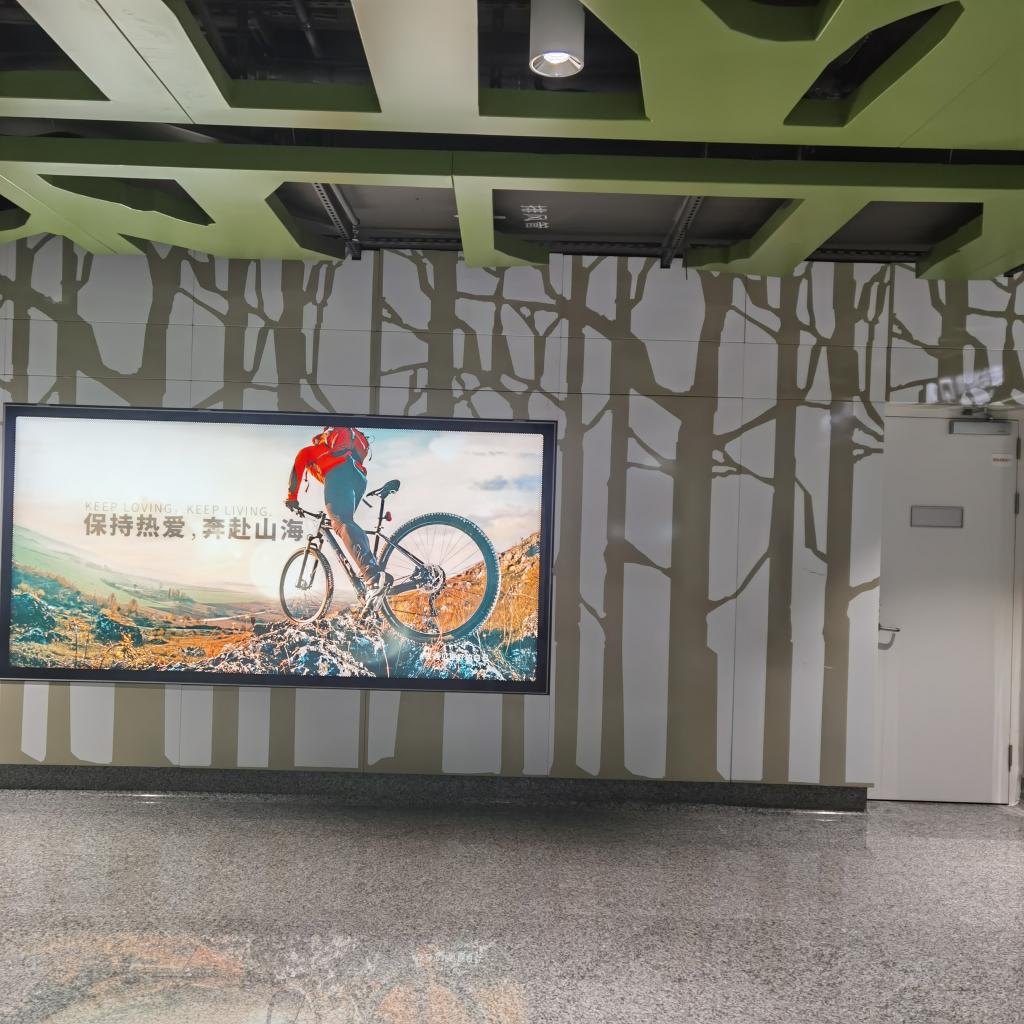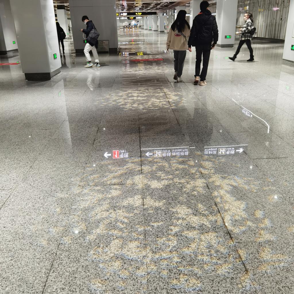 郑鸣说,2021年是党的百年华诞,一大会址当然是我们礼敬先驱们的神圣之地。现在她的“靓影”进了14号线一大会址·黄陂南路站:青灰的磨石地面、灰黄的树林墙面,还有涂了表皮的铝合金网状穹顶,那是“天上”的树林。走着走着,树林里“飞”出一辆山地自行车,一位红色冲锋衣的青年从我面前飘过,画面写:“保持热爱,奔赴山海”; 地上,疏影横斜水清浅,灯光澄澈的地面树影一路摇曳着,到了地铁闸口;往上看,咦——这里的树林黄了?原来我已经从春天来到了秋天:一行穿三季,我似到森林。
