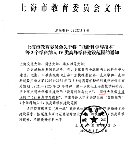 近日,上海市教委正式发布通知,由同济大学牵头,上海大学和华东理工大学作为协同单位申报的“飞行器力学与控制”学科纳入Ⅳ类高峰学科建设范围。