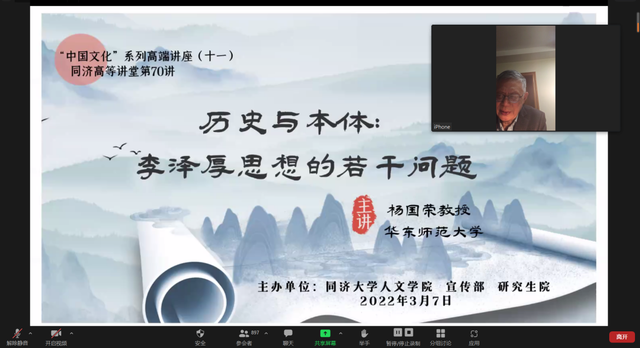 3月7日晚,同济大学“中华文化”系列高端讲座第十一讲暨同济高等讲堂第70讲通过远程视频会议举行。华东师范大学哲学系教授杨国荣应邀作了题为《历史与本体:李泽厚思想的若干问题》的讲座。全校900余名师生全程参与聆听了讲座。
