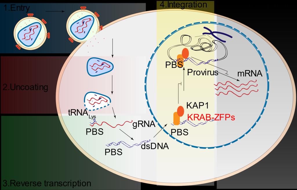 在数百万年间,逆转录病毒在入侵宿主真核生物的过程中逐渐整合到宿主细胞的基因组中,成为了内源性逆转录病毒(ERV)。这些ERV约占人类基因组的8%,并保留了许多逆转录病毒的功能性元件,包括原本用于启动逆转录的tRNA引物结合位点序列(PBS)。它们在胚胎基因组活化中发挥重要作用,如人早期胚胎在具有全能性时期的8细胞阶段高表达含有PBS-Lys元件的ERVK。尽管大多数的ERV在进化中失去了自我的复制的能力,但是它们仍旧保持了激活周围基因的转录调控能力,从而对基因组的稳定性产生威胁。在哺乳动物中,宿主抑制ERVs的策略之一是利用含KRAB结构域的锌指蛋白(KRAB-ZFP)在ERV区域建立异染色质修饰,抑制其转录活性。