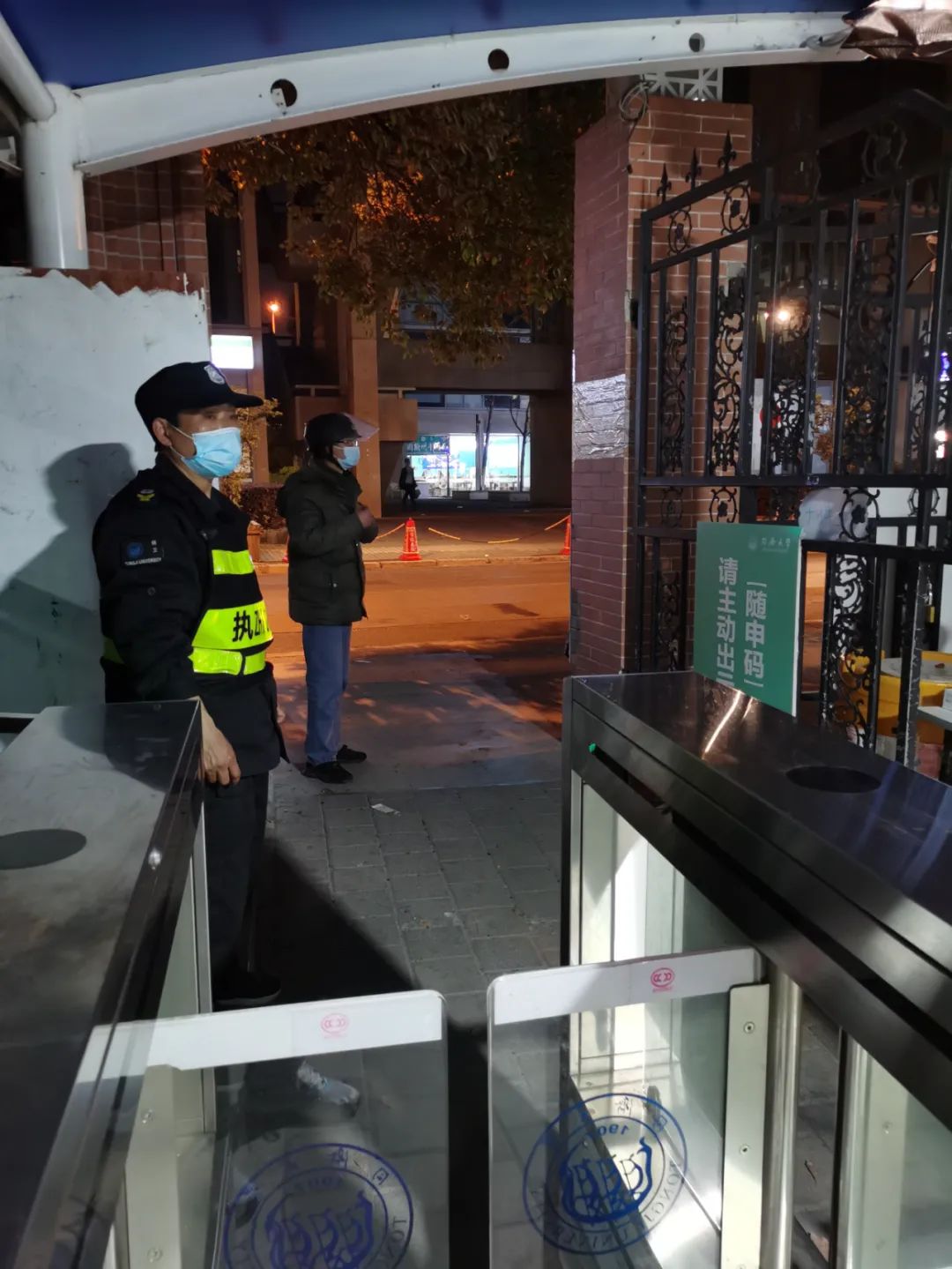 面对学校实行准封闭和封闭等多种封控模式转换的要求,面对校区内楼宇临时封闭和校内暂停接收外卖的特殊情况,保卫处全力协调校内力量,充分调配人员、车辆和警戒器材,向各校门、各执勤点位增派党员先锋岗和志愿者,遇有岗位空档期党员干部直接顶上,确保了无缝对接、不留死角。全体保卫处同志连续作战,为校门管控、楼宇封闭、核酸检测、物资转运等有序进行提供了坚强保证,切实把住了“安全口”,最大程度降低了人员流动风险。