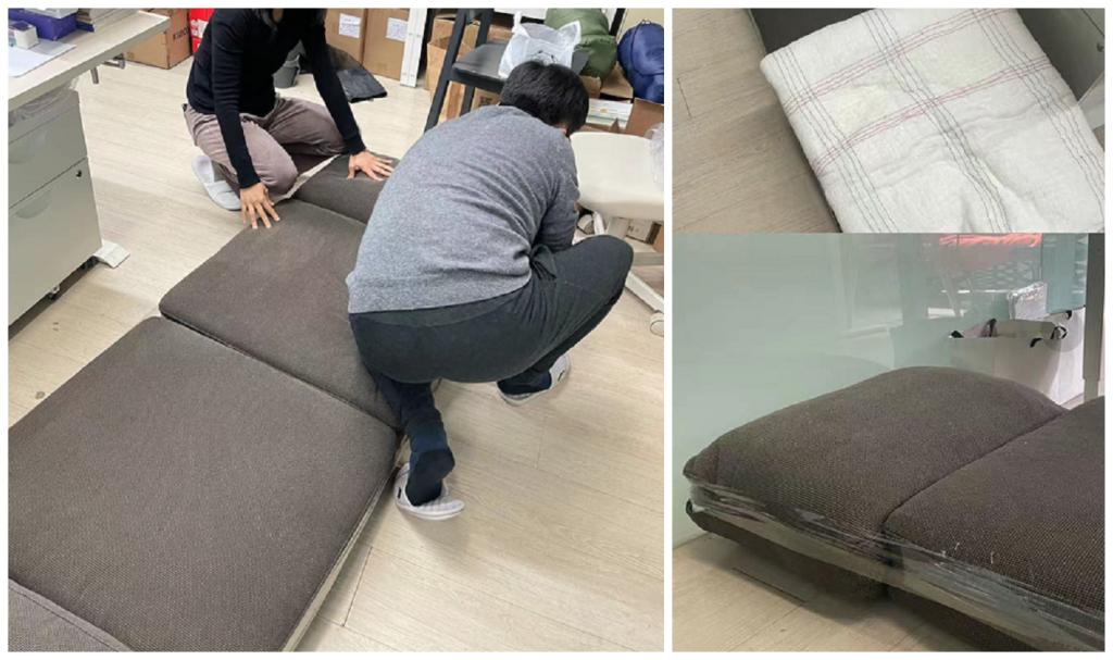 大厅里平时供师生休息的厚垫,挪到图书馆空地,再铺上瑜伽垫,就是可以伴着书香入眠、能躺6个人的完美大通铺;胶带+几个可拆卸的沙发垫和靠垫=精致单人床;沙发垫依次铺在大桌子上,再配几个蒲团,“高级民宿”既视感,不用躺就赢了;用废弃的纸板当靠背,再加上一个厚垫,就是实验室门口“随时欢迎你来坐坐”的质朴小沙发;把教研空间里的柱子当大树,绑上吊床,躺上去,闭上眼睛想象一下,天花板是蓝天,周围是森林,片刻的休闲与惬意扫去特殊时期的所有阴霾;物业小哥也很靠谱,接个水管,把饮水机废水引流到窗外浇花、养鱼……