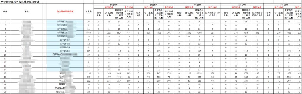 此轮疫情需在短时间内排摸掌握产业系统人员数据,3月9日晚至3月12日是学校人员底数摸清工作最重要的关键时间段。工作时间紧,加之产业系统人员分散,各单位办公场所分散、人员性质不同,校内信息不能直接转发、群发,需要一对一、点对点电话或微信通知,胡震自3月10日起全天24小时待命,值守在电脑前应对各方信息,通过电话、微信,时刻对接产业系统单位疫情防控联络员,传达沟通各类防疫信息。及时跟进产业系统留校人员情况111人、涉及3月6日及以后进入四平路校区的人员168人、各校区范围的全部企业员工4408人以及同济控股管理开通进校权限人员237人的核酸检测情况,根据核酸检测时间点紧跟各单位人员核酸情况。自3月14日起,对产业系统在沪各单位7300余人校内情况、上班情况、居家办公以及拟次日入司人员情况进行统计,严格做到当日汇总、当日汇报,不遗漏一家、不遗漏一人。