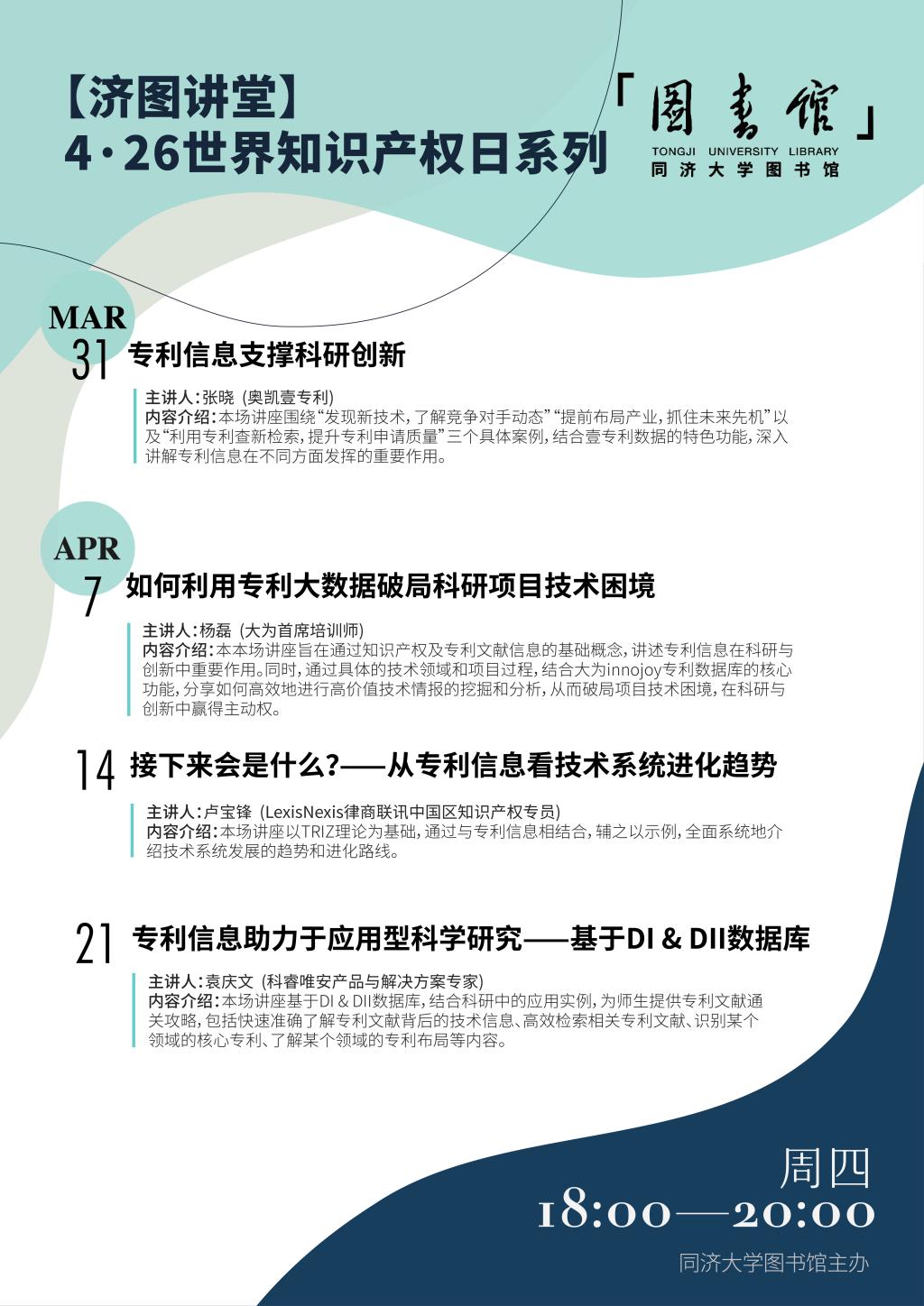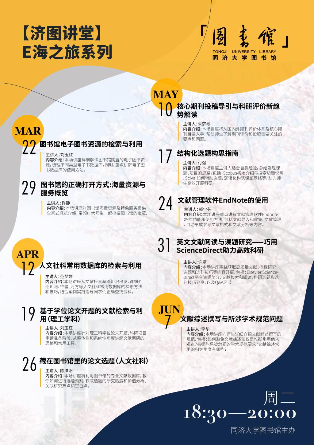 信息素养是师生精研学问、拓宽视野、科研创新的必备技能。遵照学校疫情防控要求,图书馆围绕提升师生“信息素养能力”,策划推出“济图讲堂”,并将陆续开启E海之旅、知识产权日、新生特训营等系列讲座,满足不同师生群体的不同学习研究需求,为大家提供更全面、更有针对性、更精准的嵌入学习和研究全过程的培训内容。
