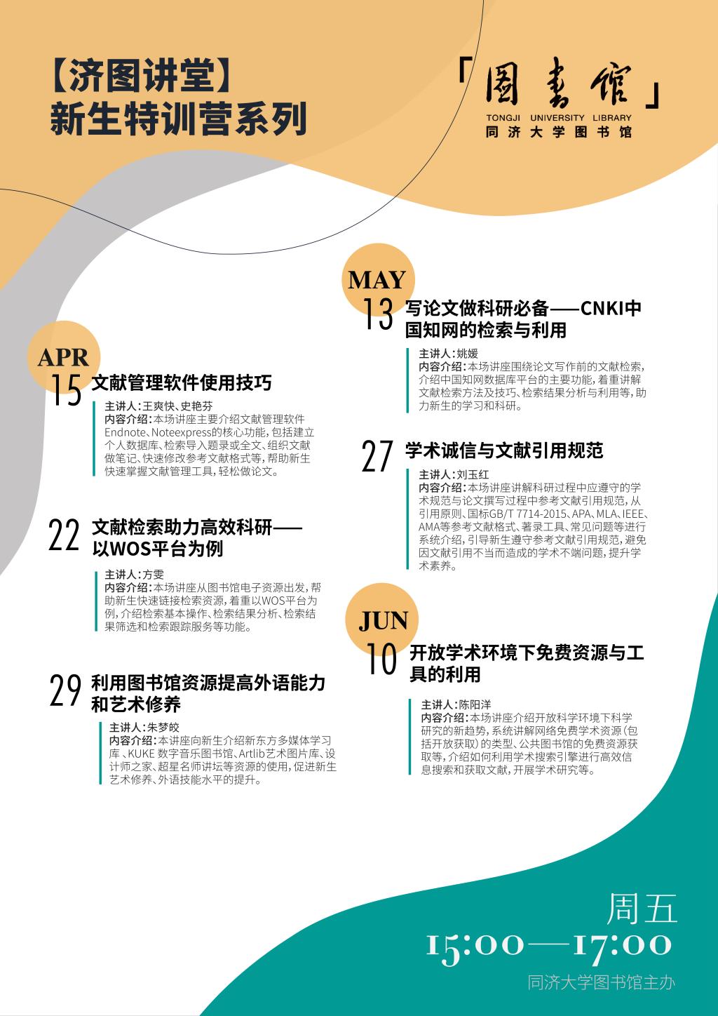 图书馆相关负责人介绍,从3月到6月,未来更多丰富的图书资源学习培训内容将陆续展开,以全方位助力学校的学科发展和科学研究。广大师生可关注讲座的报名通知,根据需求积极参与。如师生有个性化的需求,可访问图书馆学科服务栏目,联系图书馆学科馆员预约讲座(https://www.lib.tongji.edu.cn/index.php?classid=11992)。(文/史艳芬、李华、宁子晨、周黎萍 图/何黛娜)