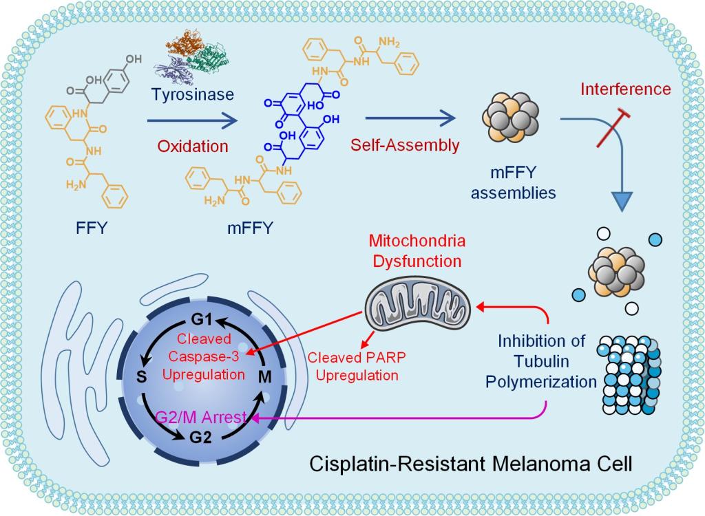 团队提出了“阻断微管抑增殖,限供能量促凋亡”的“非药物疗法”,并以耐药黑色素瘤为肿瘤模型开展了研究。研究人员向耐药黑色素瘤细胞中引入三肽(FFY),三肽在细胞内通过酶促自组装形成了mFFY纳米颗粒。研究发现,将mFFY纳米颗粒与微管蛋白共孵育后,该纳米颗粒有效抑制了微管蛋白聚合。