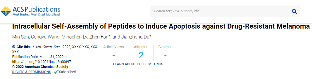 通过胞内多肽自组装,以阻断微管抑制细胞增殖、限供能量促进细胞凋亡的方式,来有效治疗耐药肿瘤。这种双管齐下的“非药物疗法”为临床晚期肿瘤和耐药性肿瘤的治疗提供了新思路。北京时间4月1日凌晨,同济大学材料科学与工程学院杜建忠/范震团队的这一研究成果以“Intracellular Self-Assembly of Peptides to Induce Apoptosis against Drug-Resistant Melanoma”为题,作为增选封面(Supplementary Cover)发表于国际顶级期刊《美国化学会志》(Journal of the American Chemical Society)。