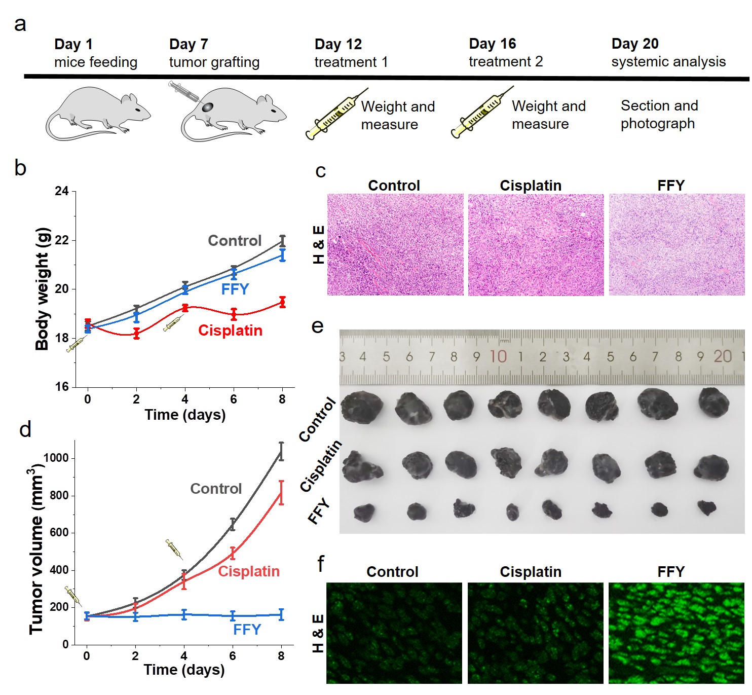 体内实验也证明了“非药物疗法”可有效逆转肿瘤耐药性。动物实验表明,在黑色素瘤周注射FFY后,观察到高水平耐药肿瘤抑制,即在两次治疗后肿瘤体积相比对照组减少了87.4%(如图3所示)。同时,与化疗药物治疗组相比,“非药物疗法”能有效减少或避免系统毒性。