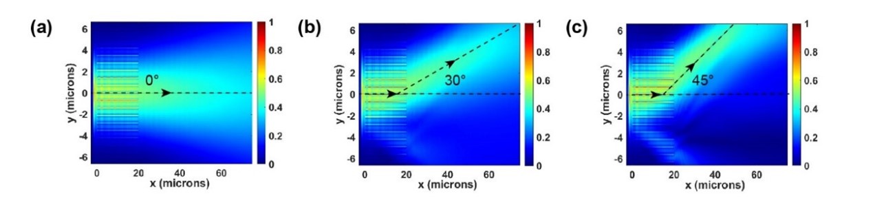 在不改变超表面整体结构的前提下,改变对于不同单元所施加的偏压,还可在片上实现可调的偏振功能。偏折功能的实现要求电磁波波前被调制为线性梯度的相位,仅利用超表面中心9个单元施加线性梯度大小的偏压即可,下图显示了该超表面实现不同角度波束偏折时的片上电场分布|Ey|。