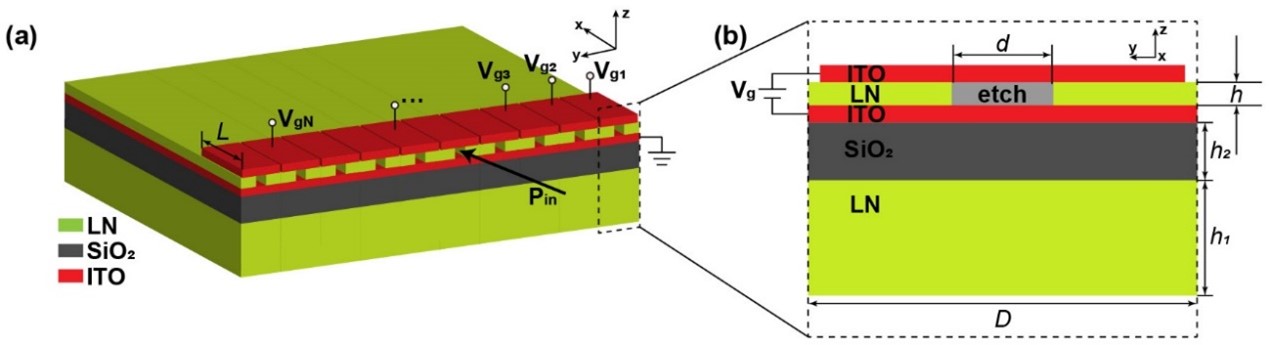 光子集成芯片相较于电子集成芯片有着信息处理和传送更快,且更加安全、高效等优点,或许能够成为下一代信息革命的技术核心。铌酸锂(LN)由于具有众多优异的性质而备受关注,例如宽带光透过性,较大的折射率,很好的非线性系数和优良的电光效应,LN因此成为很好的集成光子学材料选择。豆淋源利用课题组的电磁场仿真软件Gallop,设计了一种电可调LNOI片上超表面。该超表面由19个周期构成,每个周期正中央有一条长20μm的矩形刻槽,周期宽度为700nm,因而整个器件的宽度不超过15μm。