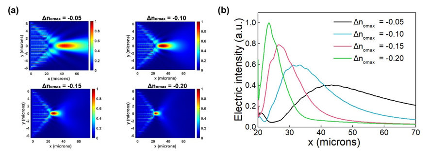 在片上,波长1550nm的y方向偏振光沿x正方向传播到超表面时,大部分光会被束缚在矩形刻槽之内,产生类似于波导内的传播。通过对单元刻槽仿真计算得知,在不施加偏压时,等长的矩形刻槽会在每个单元带来等量的相位;当对于每个单元分别施加不同大小的偏压时,其产生的电场会使得构成刻槽波导的LN折射率发生改变,从而使得光穿过每个周期的刻槽波导之后产生相位差异。每个周期上施加的电压是相互独立的,但由于超表面结构的对称性以及实现聚焦功能所需的波前相位的对称性,整个超表面的功能由9个大小不同、可连续调节的偏压控制,Δnomax来代表某种聚焦状态下所有周期中施加的最大偏压带来的LN寻常折射率变化值,超表面的聚焦效果及其动态调节。