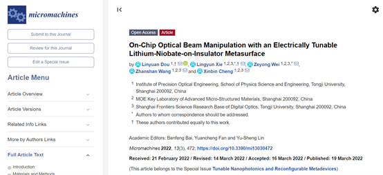 3月19日,同济大学2018级物理学试验基地班本科生豆淋源以第一作者身份在Micromachines杂志上发表论文“基于绝缘体上铌酸锂的片上电可调波束调控超表面”(“On-Chip Optical Beam Manipulation with an Electrically Tunable Lithium-Niobate-on-Insulator Metasurface”),Micromachines 期刊被Scopus、SCIE (Web of Science)和PubMed等众多数据库收录,主要聚焦微纳结构、设备和系统、应用物理方向的科学和技术。