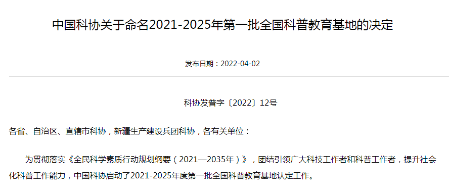 中国科协表示,希望被命名的全国科普教育基地因地制宜,再接再厉,不断提升科普公共服务能力,推进新时代科普工作模式转型升级,并围绕利用科普资源助推“双减”工作,积极对接学校课后服务需要,加强科学精神和科学方法的宣传,为全面建设社会主义现代化强国作出积极贡献。