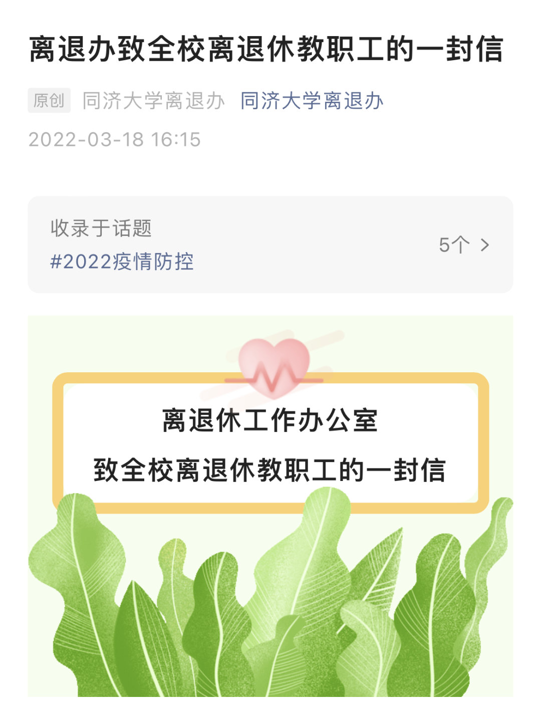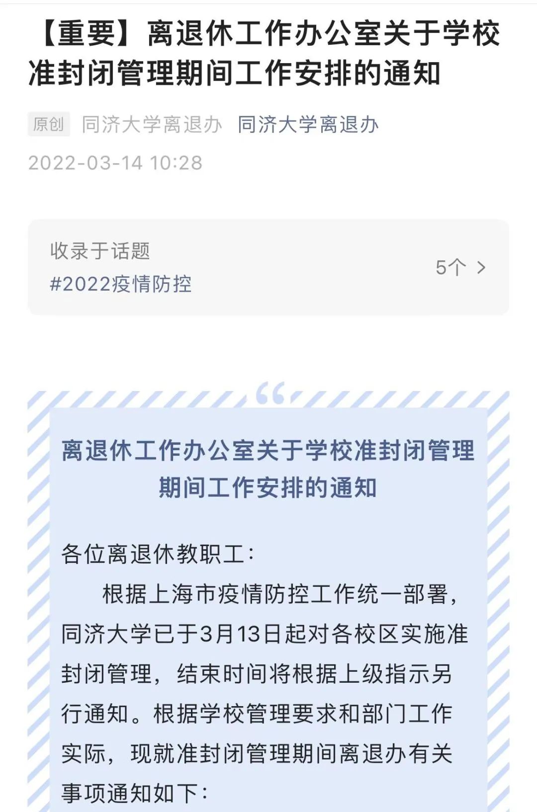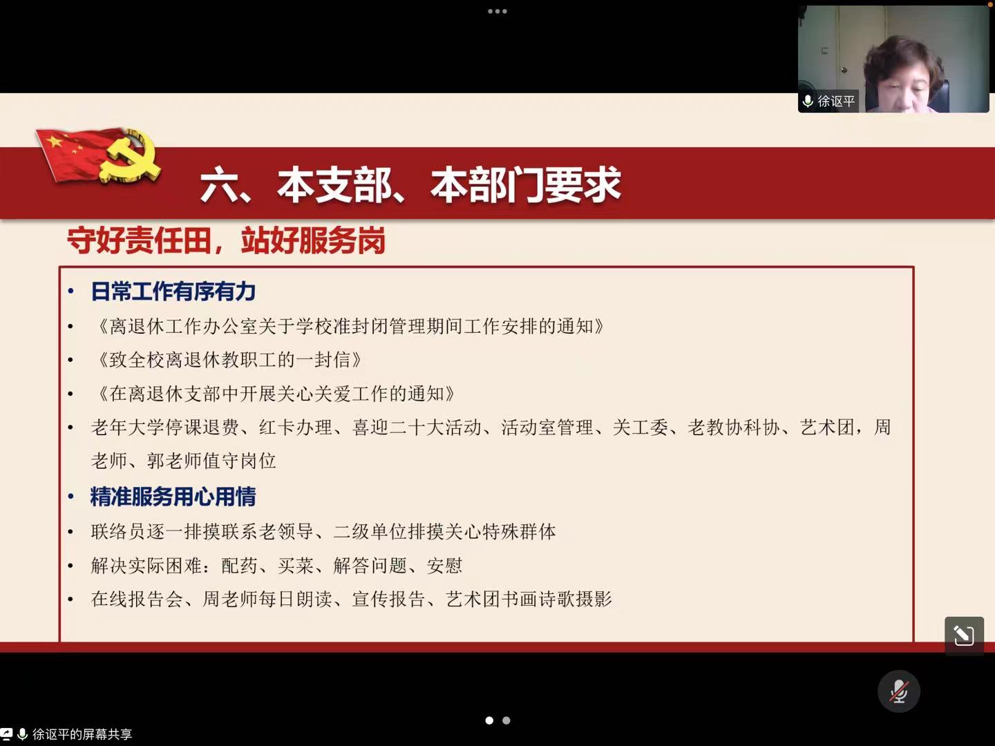 校园启动疫情防控动态管理后,离退办第一时间通过公众号和部门网站发布《离退休工作办公室关于学校准封闭管理期间工作安排的通知》,公布各科室负责人联系方式和重要工作安排,启动工作日报制,制定排班表,保证部门日常工作不停摆,重点工作有序推进。发布《致全校离退休教职工的一封信》,做好学校疫情防控政策解释,呼吁学校广大离退休教职工坚决遵守政府防疫要求,执行防疫举措,号召离退休干部发挥专业特长,在做好自我防护的情况下积极参与社区志愿服务工作,展示“同舟共济”这一鲜亮底色。党工委还在离退休党支部中下发《在离退休支部中开展关心关爱工作的通知》,要求离退休支部以拉家常等形式,通过电话、短信、微信等了解高龄、大病、足不出户的老党员近期健康、思想、生活状况,听取他们的急、难、愁、盼,帮助他们解决实际困难,号召有条件的党员到社区报到,参与疫情防控工作,营造积极抗疫、同舟共济的良好氛围,为上海争取早日实现社会面清零作出积极贡献。