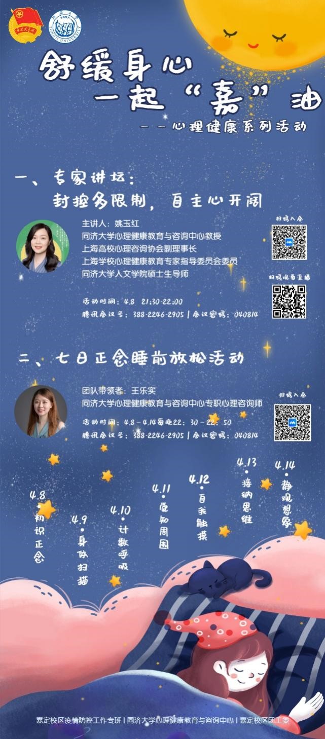 为了在当下疫情防控的关键阶段通过心理关怀帮助广大师生建立“自主性”,进一步疏解不良情绪,鼓励大家积极面对困难,4月8日晚,“舒缓身心,一起‘嘉’油”心理健康系列活动在线启动。活动由嘉定校区疫情防控专班、同济大学心理健康教育与咨询中心和嘉定校区团工委共同举办。嘉定校区学生社区网格化管理队伍师生代表、各团学组织学生骨干190余人参加了活动。