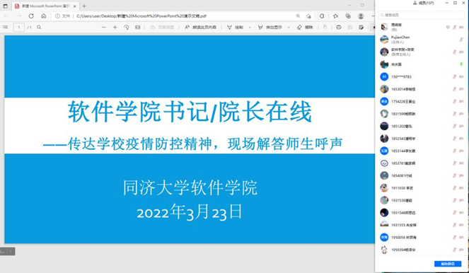 疫情就是命令,防控就是责任。3月12日晚上,在线参加完同济大学疫情防控工作调度会,学院党委书记宋庆国迅即组织召开软件学院疫情防控领导小组视频会议,讨论部署学院在“准封闭管理”下疫情防控工作。疫情当前,作为学院书记、党员干部,宋庆国放弃了早已预约好的专家门诊,3月13日一早,简单收拾了随身物品,马上赶往嘉定校区,一到学校,他就安排采购防疫物资,并召集驻校教师召开疫情防控会议,布置下一步工作。