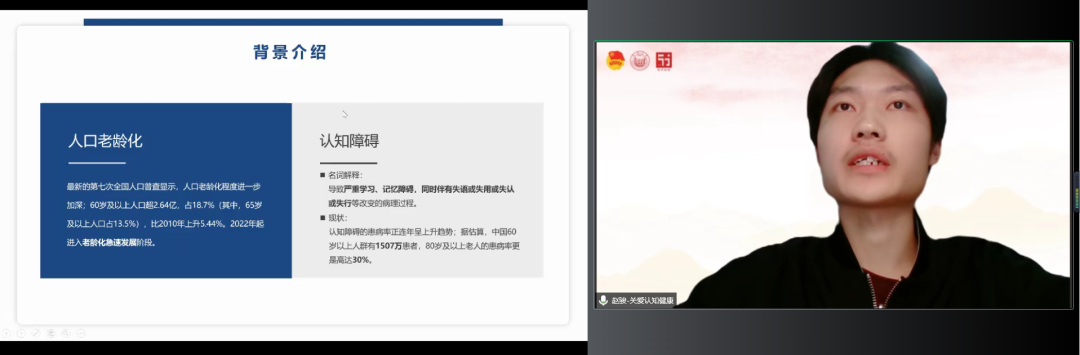 “关爱认知健康,助力积极老龄”项目团队代表赵骏同学介绍了借寒假实践的契机,“拾忆”团队深入老年社区,围绕认知健康这一主题开展了一系列的活动。团队成员发挥各自所长,举办社区认知科普讲座以及认知干预课程,同时在线上通过自行制作的科普海报和视频宣传认知症相关知识,切实增进了老年人对于认知健康的了解和认识,体现了同济青年对于老龄事业的关注和热忱。