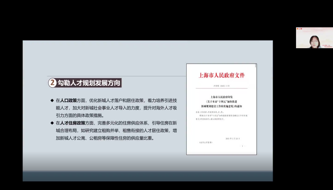 “上海五个新城青年人才研究”项目团队代表田乐华同学向大家介绍了在五个新城建设发展的大背景下对青年人才的渴望与需求,该项目通过问卷发放和线上线下的访谈收集了当今青年人才对于未来择业择居的规划和态度,并结合实地调研了解了奉贤区的建设现状,最终结合收集的资料和各城市人才政策的比较研究,为五个新城的人才吸引政策提出了建设性的意见,进一步助力了“人民城市”的建设与发展。