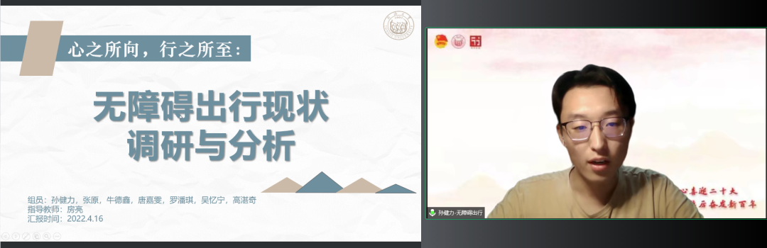 “心之所向,行之所至:无障碍出行现状调研与分析”项目团队代表孙健力同学分享了我国无障碍设施目前使用的情况,介绍了团队从线上调研到北京、青岛、昆明、无锡四市交通枢纽线下考察的过程和发现的问题。该团队结合国外相关问题的解决方案和无障碍设施的建设标准,根据分类的问题提出了相应的解决方案,力求寻找优化我国无障碍出行环境的方案,尽同济青年之力展现人文关怀。