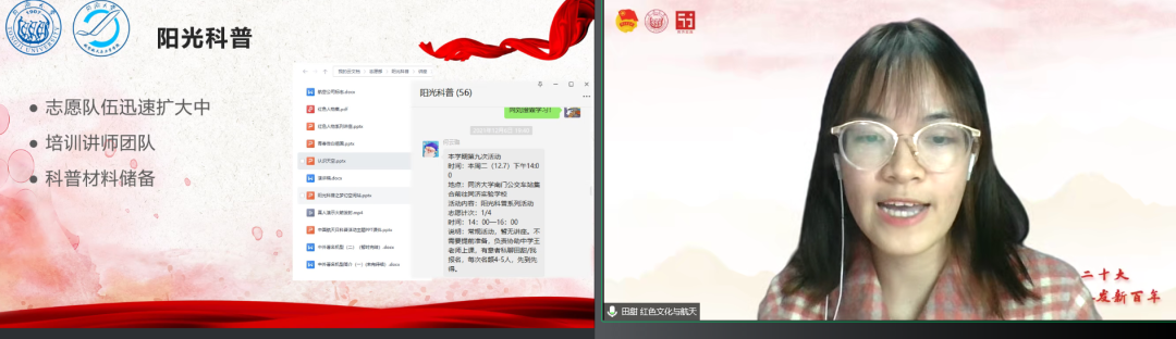 “百年恰是风华正茂——红色文化与航天”项目团队代表田甜同学分享了航空航天与红色文化依托于航空航天与力学学院阳光科普项目。该科普团队自2007年传承至今,已累积听众一万余人次,获同济大学附属实验学校颁发的“十年贡献奖”。在十五周年的日子里,红色元素的加入让科普更具鼓舞人心的力量。
